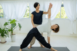 A:ヨガティーチングは言葉で動きを導くことをトレーニングします。効果的な動き・リスク管理・クライアントの姿勢動作分析など含めて、学んだことを総合的に確認します。